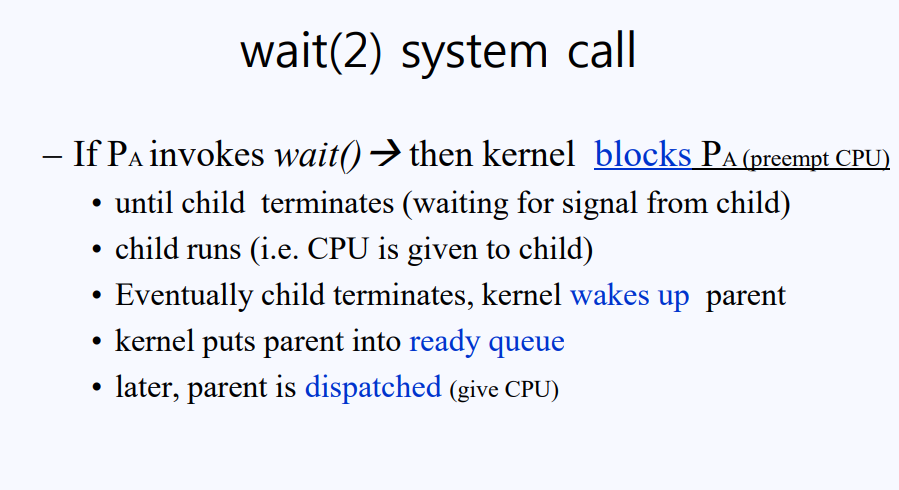 Parrent Process가 System Call wait()를 호출한다면 해당 프로세스의 CPU 사용권한은 박탈당한다(then kernel blocks P(preempt CPU).