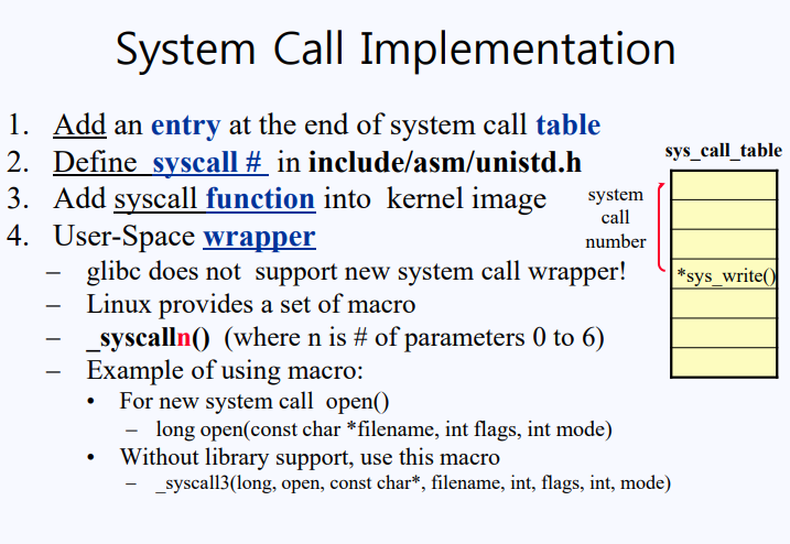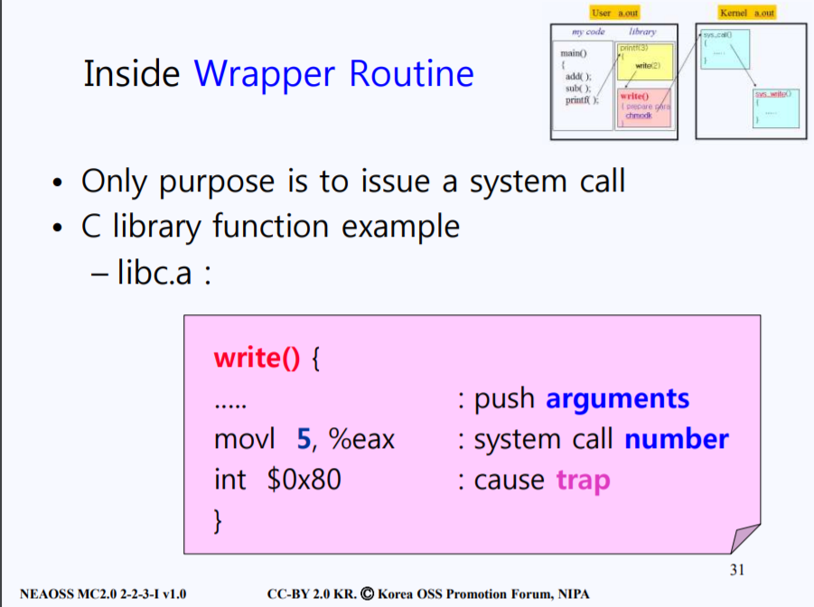 Wrapper Routine이란 이제 실제로 트랩에 타고 갈 내용들을 준비하고 트랩을 일으키는 공간이다. Wrapper Routine에서 (인텔의 경우) $0x80등 의미 없는 문자들을 이용해 Instruction을 줘 트랩을 발생시킨다. 트랩을 일으키기 전에 무엇 때문에 트랩을 발생시키는 것인지를 기록하는 Prepare parameter들을 준비해야 한다. 그 중에 가장 중요한 것은 system call number이다. 이 system call number는 커널이 가지고 있는 system call function의 시작 주소를 담고있는 Array(배열)의 Index 번호로 사용이 된다. 정리하면, printf 라이브러리 함수가 write로 바뀌고 write(2)에 대응하는 system_call을 요청한다. write system call을 요청하기 위해 system call number를 사용하게 되는데 system call number는 sys_call_table에 있는 sys_write(system call의 sys_로 시작한다)의 index이다. write system call이 system_call_table에서 몇 번 인덱스에 속해있는지는 컴파일러 제조사(IBM, 마이크로썬즈 .. etc)가 결정하는 것이기 때문에 컴파일러와 커널 간의 상호 약속이 돼 있어야 한다. 즉, 컴파일 제조사는 커널의 sys_call_table에 맞게 system call number를 세팅해 놓아야 한다. 만약 IBM의 컴파일러와 IBM에서 만든 리눅스 OS를 사용중이라면 system call number는 vendor에 의존적이라서 회사에서 system call number를 그렇게 부연했다면 사용자가 임의로 바꿀 수는 없다.