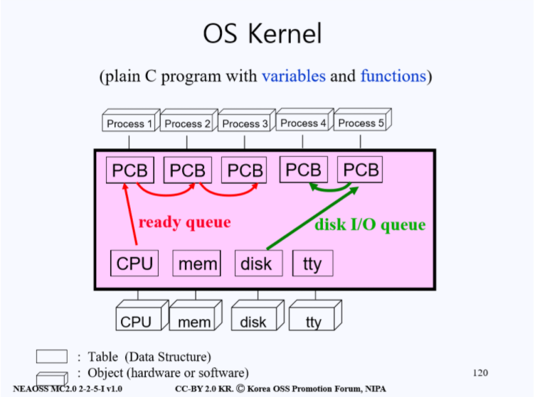 OS는 하드웨어 자원(CPU, mem, disk, tty)을 관리하고 Application들이 정상적으로 동작하도록 지원해주는 역할을 한다. Kernel 역시 이와 동일한 역할 수행을 위해 자신만의 Data Structure를 가지는데 개략적인 구조는 위 그림과 같다.
