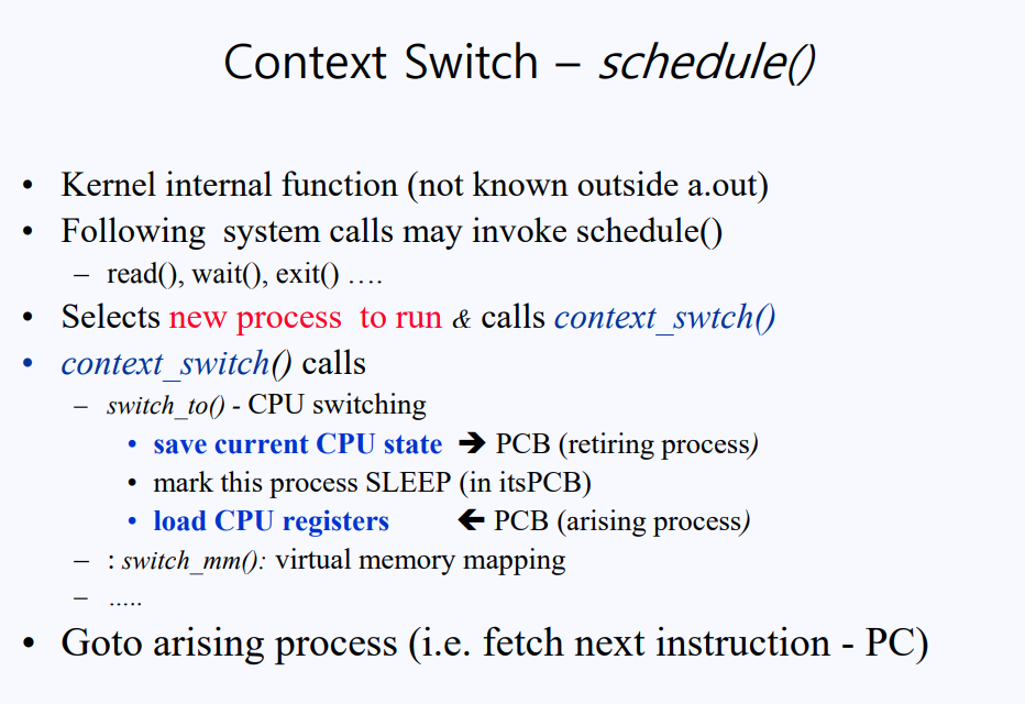- schedule() 함수는 내부(internal) 함수이며 kernel a.out에게 알려지지 않은 함수이다. 즉, 커널 밖에서는 아예 호출할 수 없다. 유저가 커널과 통신하기 위해서 커널 밖에서 사용하는 게 system call이고 system call만이 커널에 접근할 수 있는 유일한 방법인다, schedule은 아예 유저가 접근조차 할 수 없는 것이다.
