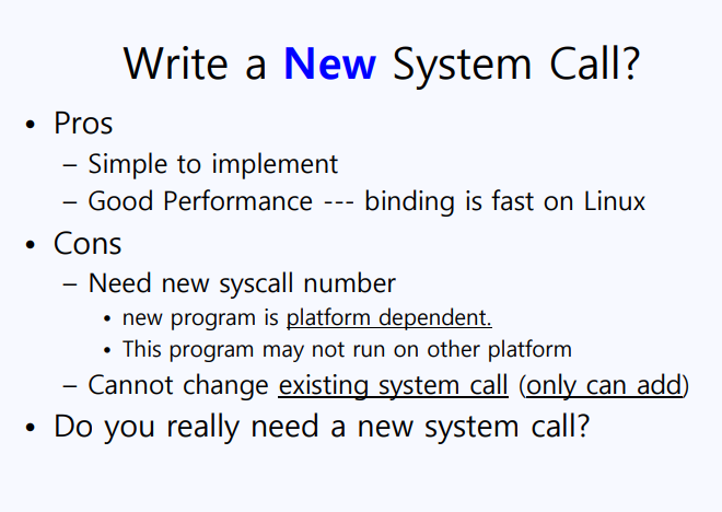 만약 내가 기존의 System Call의 단점을 보완해서 더 높은 성능을 내는 System Call을 만들었다고 하자. 새로운 시스템 콜을 만들었으니 당연히 새로운 시스템 콜 번호를 부여해야 할 것이다. 하지만, 해당 System Call은 (만약 내가 IBM에서 만든 Linux 환경에서 IBM에서 만든 컴파일러를 사용했다면) IBM에서 만든 컴파일러와 IBM에서 만든 OS 환경에서만 동작하기 때문에 대단히 플랫폼 의존적이라고 할 수 있다. 즉, 다른 시스템 환경에서는 내가 만든 시스템 콜을 호출해도 시스템 콜 번호를 추가하지 않았으니 해당 시스템 콜을 호출할 수 없을 것이다. 따라서 이 방법은 권장되지 않는다.