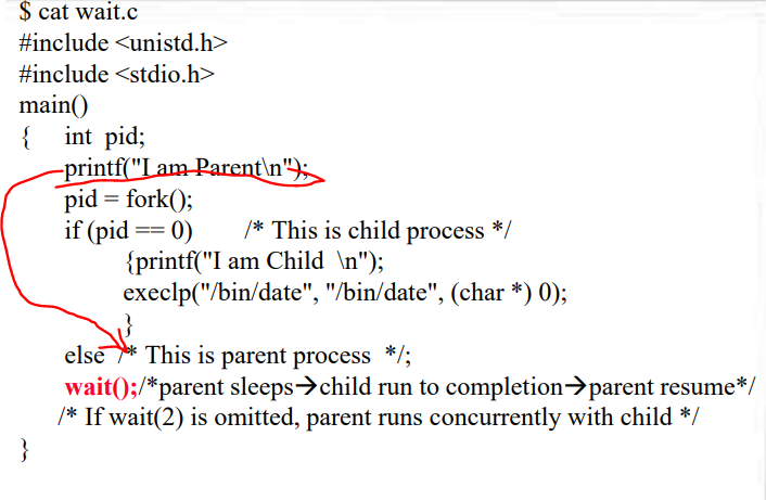 wait( ) 시스템 콜을 호출하면, 부모 프로세스는 잠들게 된다. 자식 프로세스가 끝날 때까지 wait한다. CPU 사용권한이 자식 프로세스에게 넘어가고 자식 프로세스는 자신이 할 일을 수행한다. 자식이 하는 일 중에 execlp("/bin/date"...)" 라는 명령어가 마지막으로 있으니 해당 명령어를 마지막으로 수행하고 자식 프로세스는 중료한다. 자식 프로세스가 종료했을 때 CPU는 자식 프로세스로부터 부모 프로세스를 찾는다. 그 후 CPU는 부모 프로세스를 다시 자신의 대기명단(ready queue)에 등록시킨다. 이후 부모가 CPU 사용권한을 받았을 때가 바로 wait( ) 시스템 콜이 끝나는 지점이다. 부모는 이후 자신의 남은 일이 있었다면 해당 작업을 진행하게 된다.