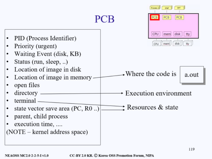 - 운영체제에서 프로세스는 PCB로 나타내어지며, PCB는 프로세스에 대한 중요한 정보를 가지고 있는 자료이다. 각 프로세스가 생성될 때마다 고유의 PCB가 생성되고, 프로세스가 완료되면 PCB는 제거된다.