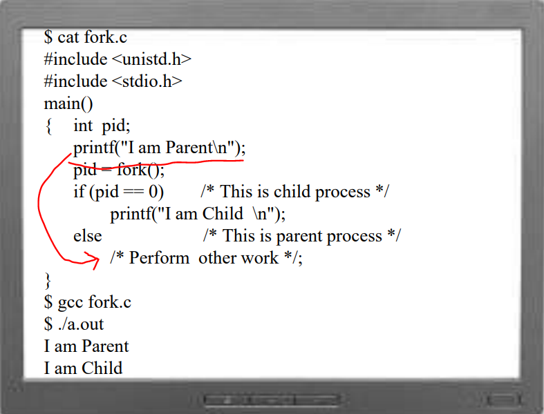 fork는 parrent 프로세스 정말 똑같이 복사한다. 여기서 부모 프로세스를 그대로 복사했다는 것은 어디서 실행해야 할지를 알려주는 PC(Program Counter)와 SP(Stack Pointer) 또한 복사되었다는 걸 의미한다. 즉, 아래 코드에서 pid = fork() 구문에서 자식 프로세스가 시작된다. 부모 프로세스는 그 다음 명령을 이어갈 것이다. 그렇다면 생성된 자식 프로세스의 시작점은 생성된 그 시점의 부모 프로세스의 이미지를 그대로 복사하기 때문에 pid=fork() 명령 다음이 된다. 부모 프로세스와 자식 프로세스가 구분되는 점은 fork() 한 다음에 return value가 상이하다는 것이다. 부모 프로세스의 return 값은 0인 반면, 자식 프로세스의 return 값은 0이 수를 리턴받는다. 즉, 위 코드에서는 fork()의 return value로 부모 프로세스와 자식 프로세스 실행 분기점이 나뉘는 것이다.