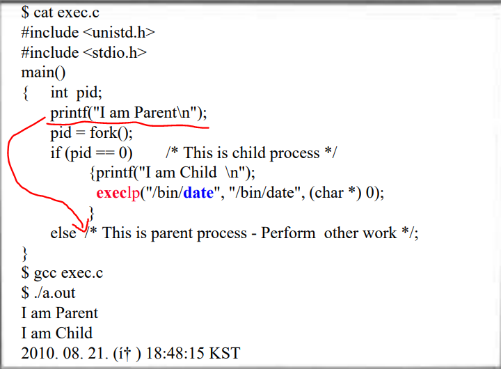 fork를 통해 자식 프로세스는 부모 프로세스와 아직까지는 똑같은 프로세스이다. 이렇게 생성된 자식 프로세스를 부모 프로세스와 다르게 해주는 게 exec이다. 위 코드에서 'execlp("/bin/data", "/bin/date", (char *) 0);' 은 bin 디렉토리에 있는 date 프로그램을 현재 프로세스에서 실행시키라는 의미이다. 즉, 생성된 자식 프로세스는 exec로 인해서 완전히 새로운 프로그램으로 덮어 씌워진다(Overwrite). Child Process가 Overwrite된 후, date 프로그램의 main으로 가서 명령을 실행한다. 새로운 프로세스가 생긴 것이 아니라 덧씌워졌기 때문에 PID는 바뀌지 않지만 프로세스를 구성하는 코드(기계어)와 데이터, 힙, 그리고 스택 영역의 값들이 exec으로 인해 새로운 프로그램의 것을 바뀌게 된다.