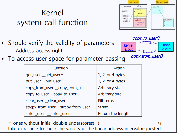 write 같은 경우는 커널이 write만 해주면 그만이지만 read 같은 작업은 커널이 해당 데이터를 읽은 다음에 유저에게 읽은 데이터를 넘겨줄 필요가 있다. 즉, user가 데이터를 주거나 받을 필요가 있을 때는 데이터 IO가 가능한 커널과 통신할 필요가 있다. 그래서 커널은 위 그림처럼 유저의 데이터 공간에 접근할 수 있는 여러가지 함수를 장착하고 있다. kernel a.out과 user a.out은 독립된 프로그램이다. 그렇다면 독립된 프로그램의 한계를 넘어서 서로 다른 프로그램끼리 데이터를 교환할 때는 어떻게 해야할까? 리눅스는 Multi_User_System이기 때문에 시스템의 보안을 위해서 오직 커널만이 모든 메모리에 접근이 가능하다. 즉, 커널이 유저에게 데이터를 보내줄 수는 있어도 유저가 커널로부터 데이터를 읽어 올 수는 없고 커널이 유저한테서 데이터를 읽어올 수는 있어도 유저가 커널한테 데이터를 보낼 수는 없다. 앞에서 계속 강조해 왔지만 모든 I/O는 커널을 통해서만이 이루어 진다는 뜻이다.